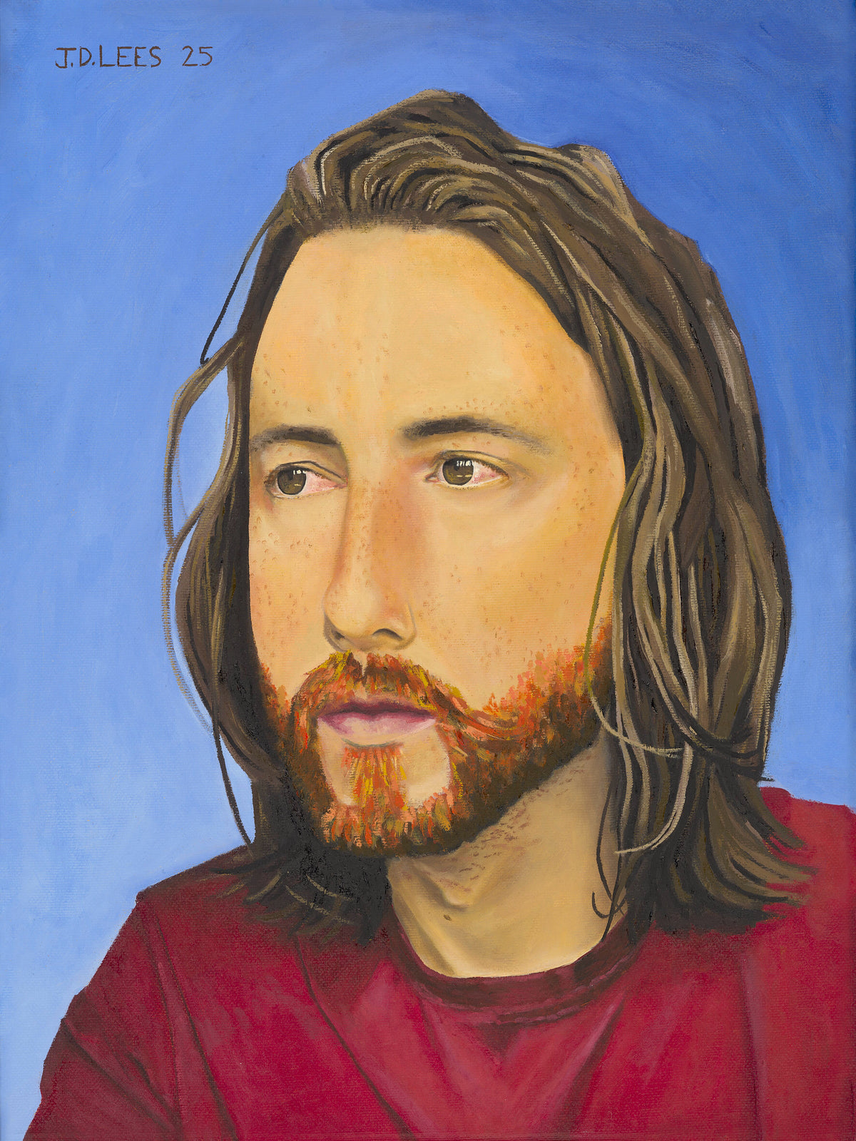 Having lived through moments where the boundaries between life and death felt uncertain, Jonathan brings a rare depth of perspective to his art. His self-portrait embodies that difficult chapter: glassy red eyes, a weary, distant gaze; and a dishevelled appearance - serving as a personal reminder of resilience and growth.